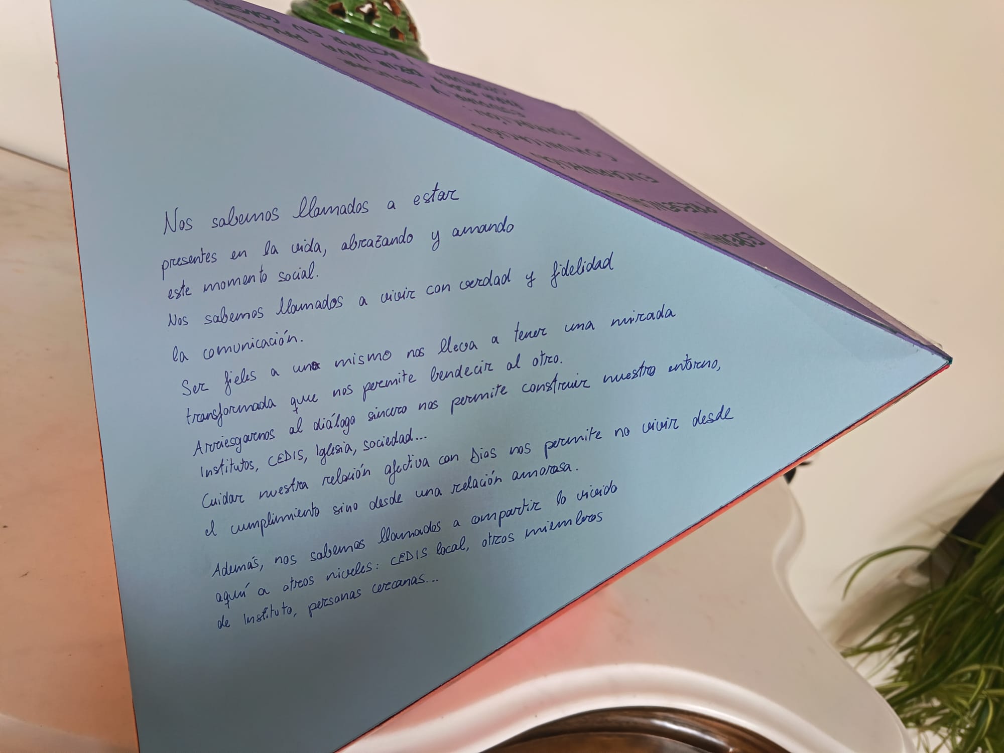 A sus pies, en el momento de las ofrendas, le presentamos nuestros anhelos, nuestros propósitos, nuestros compromisos, uniendo todas las cartulinas en un octaedro multicolor. Junto a toda la Iglesia, y desde ella, los Institutos Seculares somos ese abanico diverso que muestra al mundo su mayor tesoro, lo más valioso que tenemos, nuestro Señor Jesucristo, Camino, Verdad y Vida para toda la humanidad.